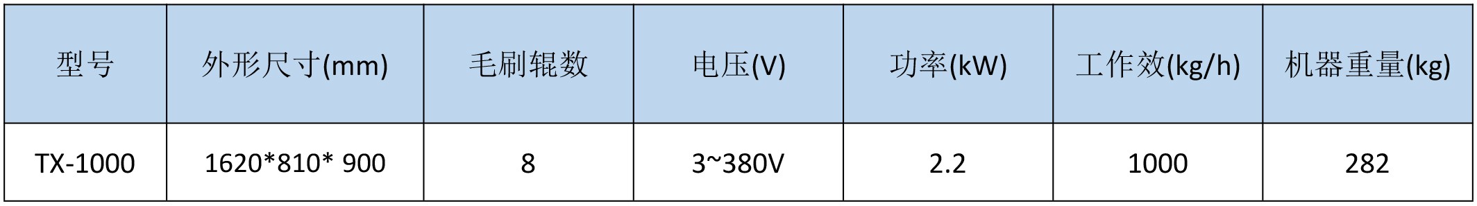 TX-1000脫皮清洗機(jī)主要由機(jī)架、組合式減速機(jī)、凹凸毛刷輥,護(hù)罩、電器控制部分組成。