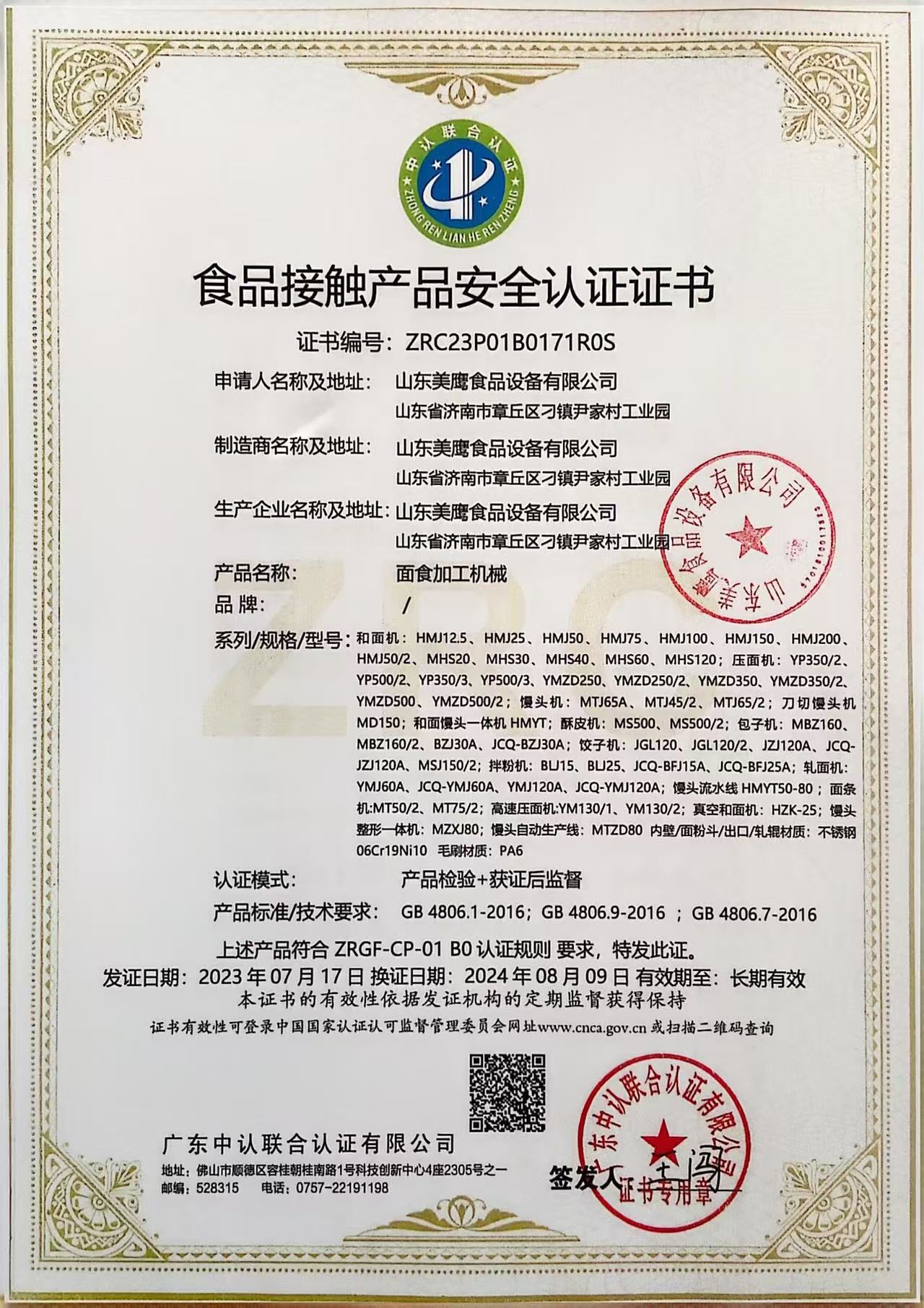 食品接觸產品安全認證(面食機械)